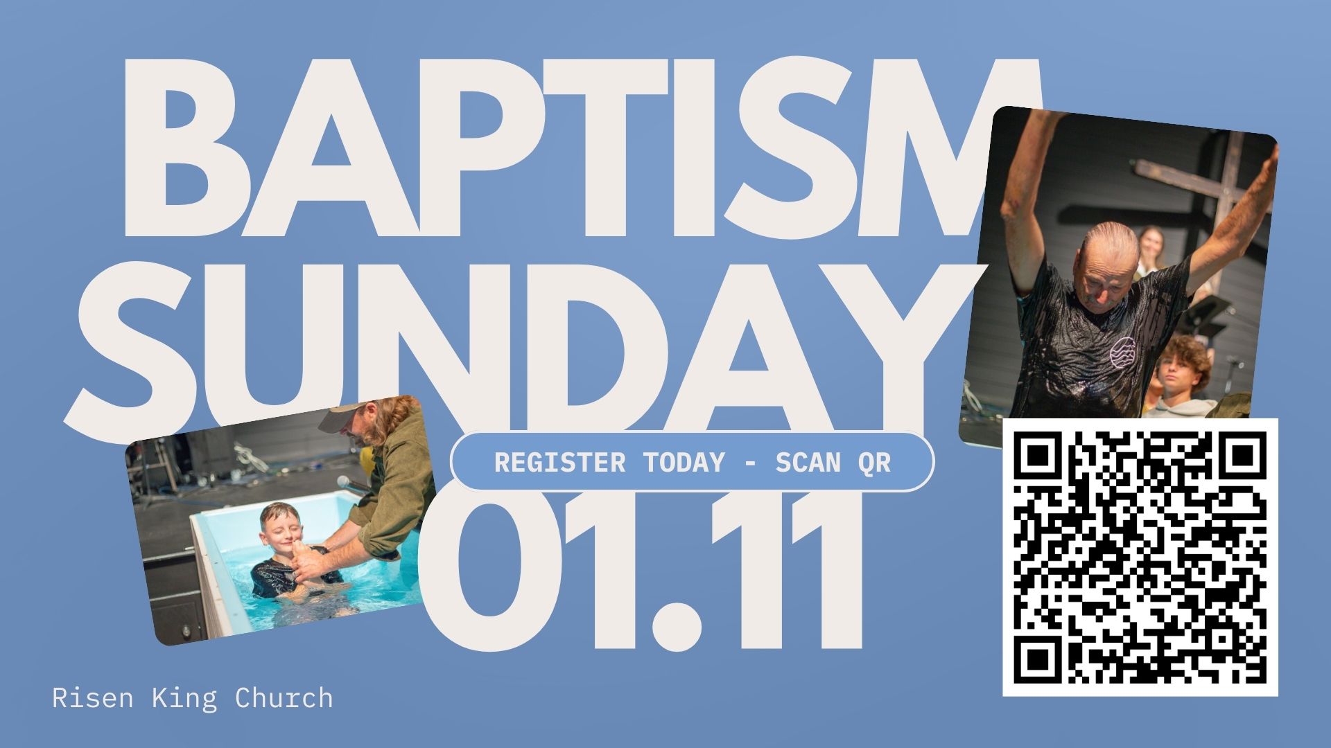 We’re so excited for the upcoming baptisms at Risen King Church. Each one is a personal step of faith and a beautiful picture of new life in Jesus. We can’t wait to celebrate together as a church family. Baptisms will be at 9am and 11am. Click on the QR code to register.