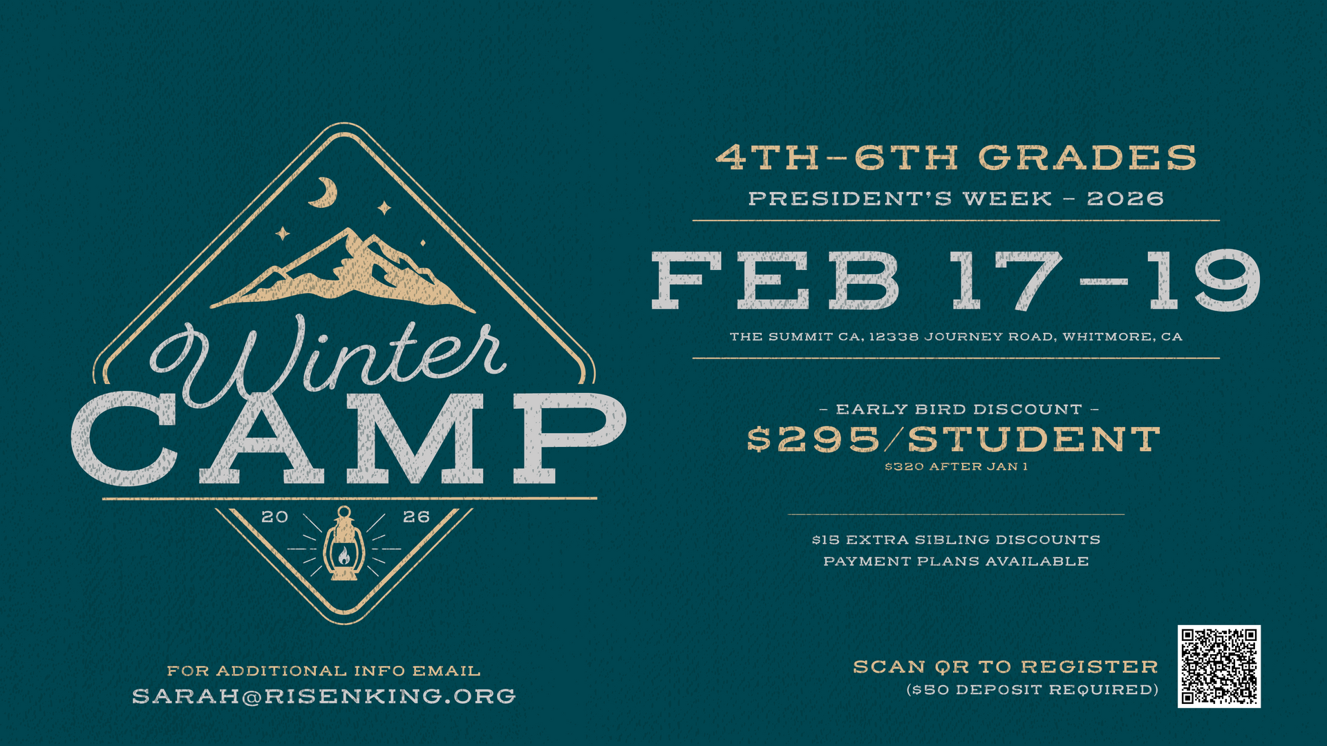 A camp just for 4th-6th grade at The Summit, CA 12338 Journey Rd., Whitmore. Come join us for some winter fun in the mountains!